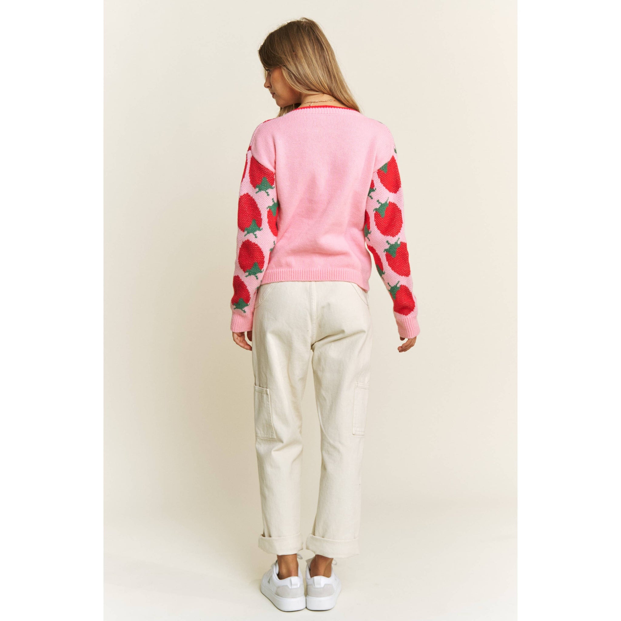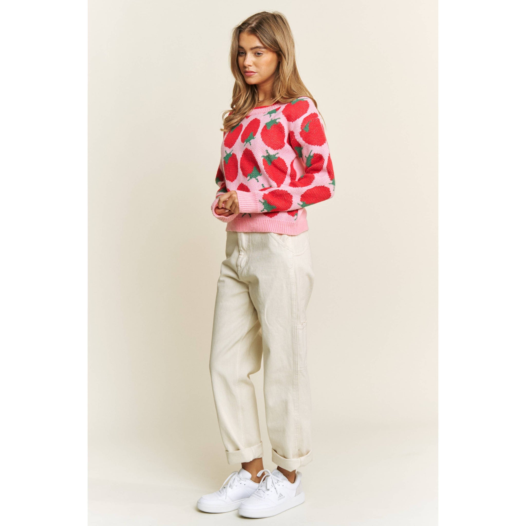 Medium-weight soft knitting sweater - Colorful strawberry jacquard colorblock design - Rib bands on bottom, neckline and sleeves - Model is 5' 8" 32-23-34 and wearing a Small